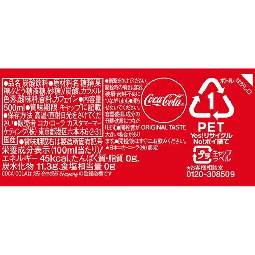【品名・名称】炭酸飲料【コカ・コーラの原材料】糖類(果糖ぶどう糖液糖、砂糖)、炭酸、カラメル色素、酸味料、香料、カフェイン【栄養成分】(100mLあたり)エネルギー:45kcaL、たんぱく質:0g、脂質:0g、炭水化物:11.3g、食塩相当量:0g【保存方法】高温・直射日光を避けてください。