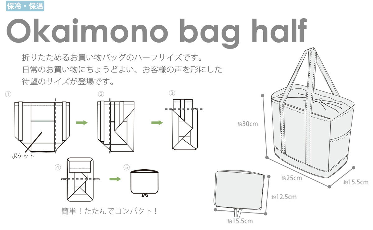 保冷お買い物バッグ・ハーフサイズ 折りたたみ簡単でコンパクトになる、便利なエコバッグ(保冷バッグ)。